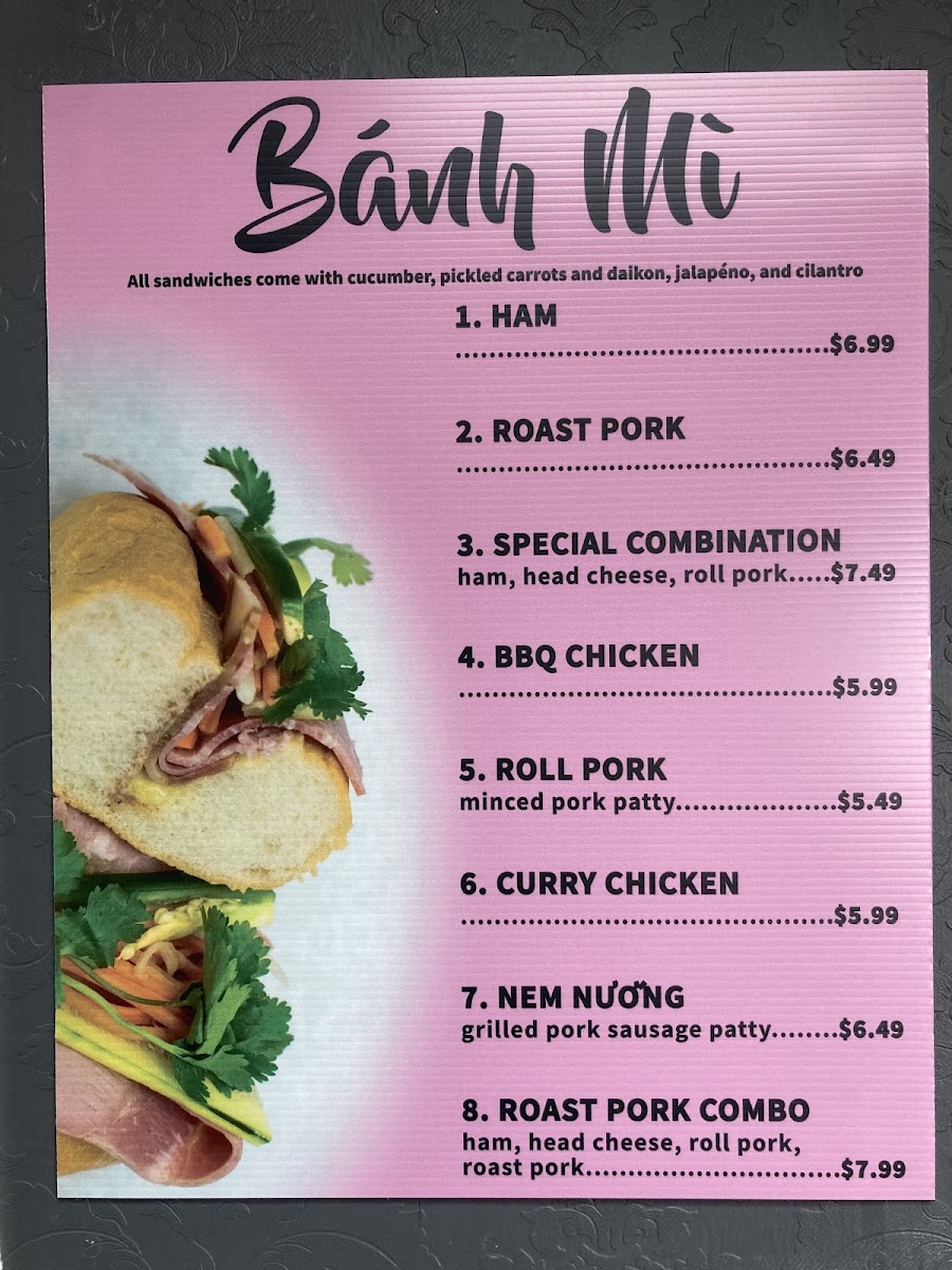 As you step inside, you're greeted with a warm ambiance filled with the aromas of freshly prepared food. The highlight of the menu is undoubtedly the Banh Mi, a Vietnamese sandwich that comes in various delightful combinations. Options like the Special Combination featuring ham, head cheese, and roll pork at just $8.49 are not to be missed. For those craving a savory twist, the Curry Chicken Banh Mi for $6.99 delivers just the right amount of spice and flavor.